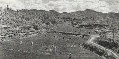 “下雨一团糟,晒干象把刀,洪来一片白,锈水满田铺。”这是龙川县铁场公社铁场大队红旗生产队阿婆麻坑昔日的写照。从1972年冬起,红旗生产队的干部和社员,学大寨改天换地。图为阿婆坑的全景。(1975年)