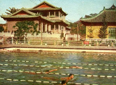 正当我国吉林省举行滑雪比赛的时候,广东省却展开了露天游泳运动。这是在新会县举行的广东冬季游泳运动大会,参加比赛的有25个县的390名运动员。(1959年)