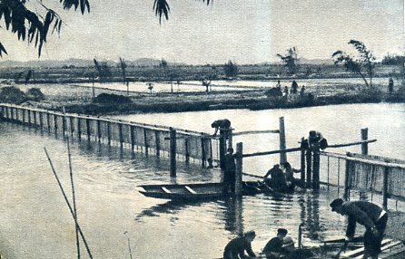 全县河流纵横,许多河流都变成了鱼塘。人们在河上装拦河闸,尽管河水滔滔流去,鱼儿却留在它们的家乡。