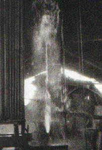 地质工作者在邓屋大队钻探地下热水时,有个钻孔喷发的水头高数米,水温摄氏92度,现已建成地热发电站。(1973年)