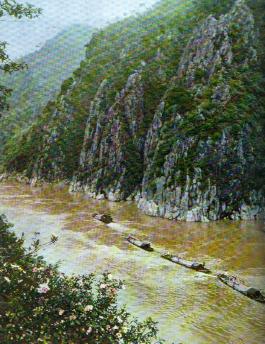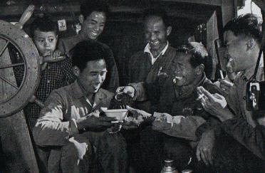 佛冈县水上运输社,成立于1958年大跃进高潮中。图是运输社的船队,满载着工人对农民的深情厚谊,穿云崖,越浅滩,鼓浪前进。(1974年)