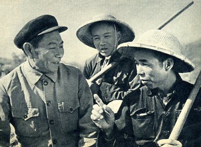 中共海丰县委书记兼海丰县副县长、当年的赤卫队员黎连平(左),在本县老革命根据地的山村之一—大安洞,同党支部书记曾士炎(中)、生产大队长曾元旺(右)谈话,了解山区人民的生产和生活情况。