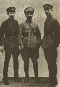 1926年9月初,北伐军开始武昌攻城战。图为三指挥在前线合影。右起:邓演达、苏联顾问铁罗尼、张发奎。