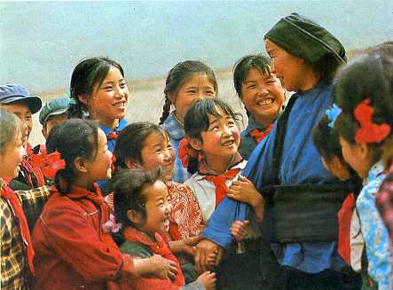 腊子口公社党委书记何克俊(右一)和社员一起参观集体生产劳动。