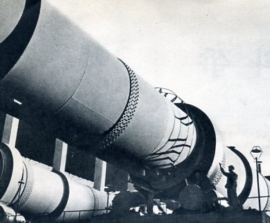 甘肃省永登水泥厂继1962年超额30%完成全年计划后,1963年以来,该厂的增产计划也完成得较好。图为工人在维护大窑,保证设备安全运转。(1963年)