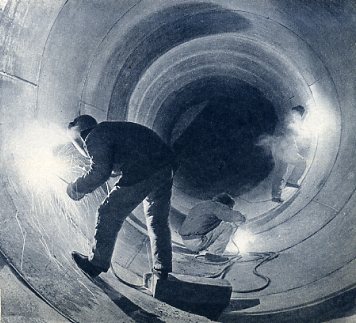 扩建工程又开始施工了,工人们在焊制巨大的油塔壳。