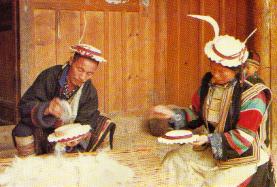制毡帽的白马藏人。白马人男女老少都戴白色荷叶边毡帽,帽顶插饰白鸡羽毛。该习俗来至他们对白鸡的崇拜。男子插一支挺直的羽毛,象征人品要好,心要直爽;女子插几支弯曲的羽毛,象征美丽温柔。白马男子有髻发习惯,仅留头顶一撮头发编一条小辫子绾在头顶。女子无论老少都梳一条辫子,饰海贝发饰。