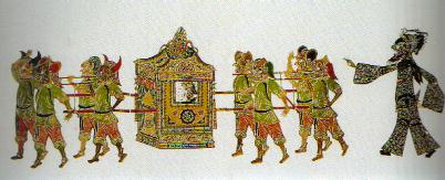 皮影《钟馗嫁妹》。传说钟馗有个同乡好友杜平,为人乐善好施,资助钟馗赴试。钟馗因相貌丑陋而被皇帝免去狀元,一怒之下,撞阶而死。与他一同应试的杜平便将其隆重安葬。钟馗被玉帝封为“驱魔帝君”之后,为报答杜平生前恩义,亲率鬼卒于除夕时返家,将妹妹嫁给了杜平。
