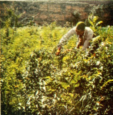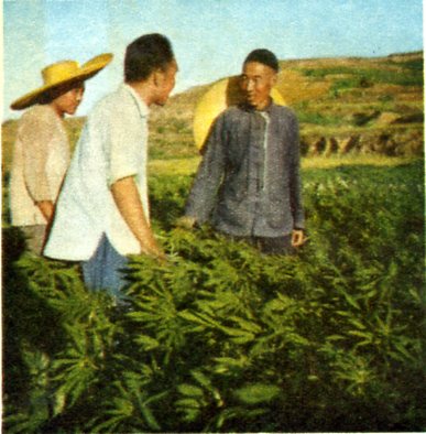 邓家堡农业社主任邓海海(右)和水土保持科学试验场的工作人员在观察山坡上第一次种的大麻。