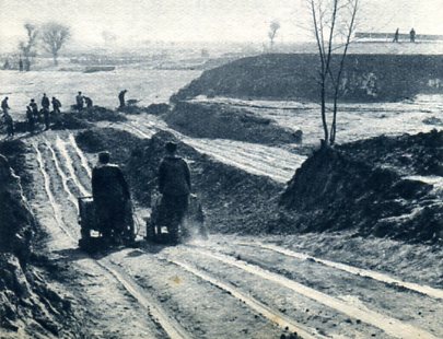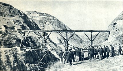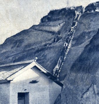 自动倒土的三轮运土车,两部一组,用绳索相连,重车顺坡而下时空空车就顺坡而上,有如飞龙。