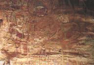 (北周)石胎泥塑。武山县东北的水廉洞石窟群中,以拉梢寺石窟(又称大佛窟)的北周大型石胎泥塑一佛二菩萨像艺术造诣最高。中间坐佛通高近40公尺,为摩岩石胎泥塑的空前杰作。