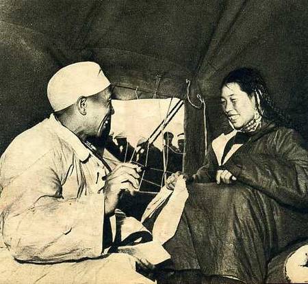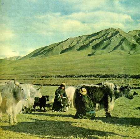 天祝自治区的牧民拉本爽的妻子达照吉抱着幼孩看拉本爽的妹妹宽照吉在篷帐前捣酥油。