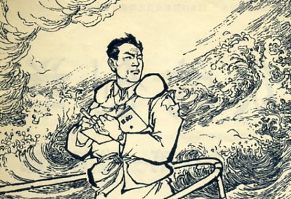 敌机下在扫射,全船可能迅即下沉。这时,同志们镇定如常,团结如钢,互相帮助穿好救生衣,有组织地下海。报务员黄伟超拿着红光闪闪的《毛主席语录》从报房里冲出来,宝书的万丈光芒,照亮了英雄们前进的道路。