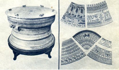 关于僮族的铜鼓,公元四十三年已有记载。它是作战、集会和祭祀时用的。这一个重达450公斤。右边是从鼓上拓下来的花纹。