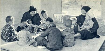 全家人都在农业社里各得其所,连老母亲(左)也帮助照顾下地妇女的孩子。
