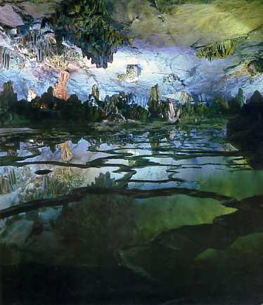 桂林芦笛岩。岩洞深邃,钟乳石笋多姿。