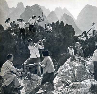 都安瑶族自治县位于桂西大石山区,境内石山林立,是个有名的“九分石头一分土”的穷山区。图为都安各族人民在战石海,造平原。(摘自《民族画报》1979年第1期)