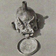 铜人灯。高14厘米,人作跪势,手捧铜盘,头戴莲花形小帽。有铜链从铜人的鼻端穿过,可以悬挂或手提。