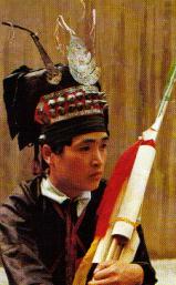 融水县男子盛装头饰。花瑶男子的包头样式很别致。他们将长长的青布帕缠绕在头上呈高筒状,盛装时插饰羽毛和银饰。短发露在包头外面,分别垂至眼角。