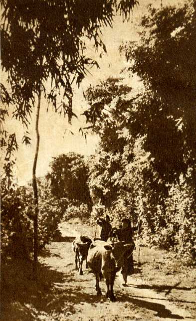 一天的劳动完毕了,僮族人民唱着山歌从田里走回家去。