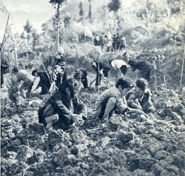 少年农业社。普定县少年农业社的社员正在地里劳动。这个社的组织和一般农业社一样,建社三年以来已发展到44名社员,其中最大的14岁,最小的才7岁,有41人都是在校的小学生。他们在农业社、共青团组织和家长的帮助下,利用课余时间开荒生产,劳动的果实足以解决他们的学费和文具费开支。(1958年)