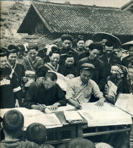 今年秋收前后,我国农业合作化运动获得了进一步的发展。从7月到9月初,贵州一省新建的农业生产合作社就有2万4千多个。凯里今年计划建社103个。“七一”农业生产合作社在此宣告成立。(1955年)