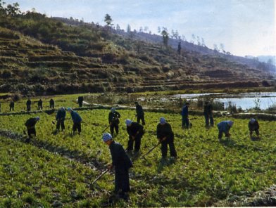 过去侗家人每年只种一糯谷,现在已学会种植小麦、油菜、玉米等作物。这是社员们在小麦田里薅草。