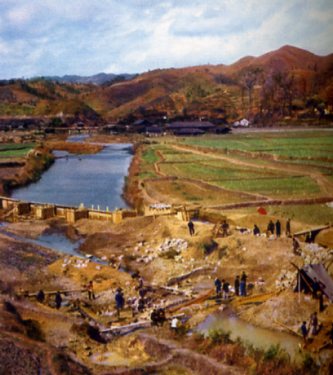 潘老公社和中潮公社合修的羊滚坝水坝工地一角。