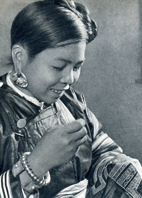 侗家的刺绣有很高的艺术水平。这是侗家姑娘在绣围裙。