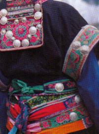 惠水苗族女子服饰、头饰。惠水摆金苗族女子服饰以外衣阔短、大袖和背牌、腰带为其特色。女子婚否以头饰为区别,已婚者包黑帕,未婚者包花帕并饰银头插。