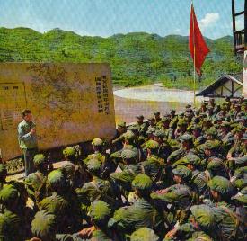 解放军某部指战员在当年红军二渡赤水的渡口—太平渡口,听当年参加四渡赤水河的红军老战士王绍琏讲述四渡赤水河的情景。(1975年)