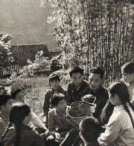 曾给红军带过路的易少香,现在是习水县柑甜公社胜利大队党支部书记。这是他用当年红军赠送给他的藤包,给青年社员进行革命传统教育。(1975年)