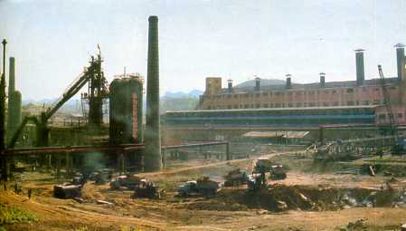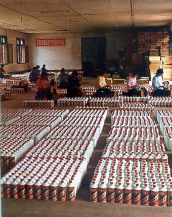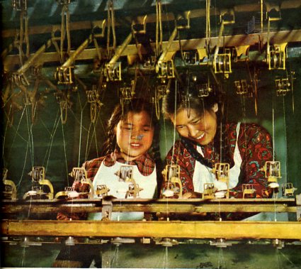 市内原来只有三个小工厂,现在已经新建了发电、农具、制药、丝织等7个工厂。丝织厂年产绸缎178000公尺。这是缫丝工人。