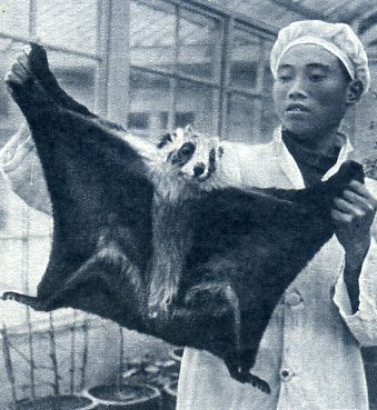 在贵州遵义市纪念公园里,最近新添了一只能飞的松鼠。这是一只雄性飞松鼠,头部象小熊猫,腿和爪类似猿猴,前后腿之间,各有一张软膜相连。它步行攀爬时,形状象猫;飞起时,又形式蝙蝠,在空旷处能滑翔三四十公尺。这只飞松鼠是娄山关林场的伐木工人捕捉到的。(1959年)