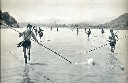 当年红军用沿河两岸盛产的楠竹作为渡河的器材。今天,民兵们利用楠竹开展群众性的练兵活动。
