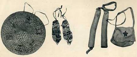 当年红军用过的竹笠、草鞋、干粮袋、挎包。