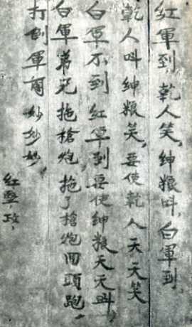 红军战士在木板墙上写的标语。标语上的“干人”,是贵州方言,即“穷人”。
