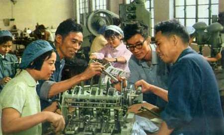 长征电器九厂装配车间的工人技术人员和领导干部在一起研究装配的技术问题。