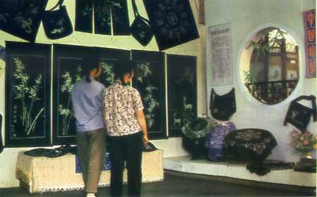 遵义市的丝绸、茶叶、化工产品和手工艺品远销国外。这是富有地方特色的腊染展品。