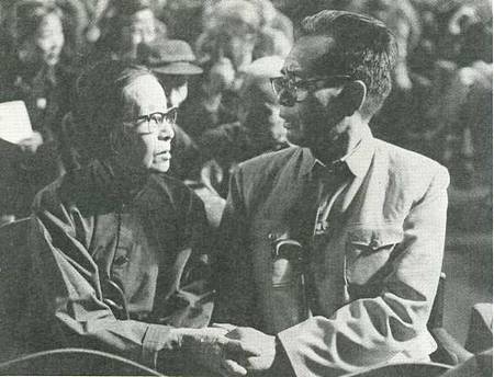 受四人帮迫害致半身瘫痪的作家方纪和老舍夫人在第三次全国文代会上。