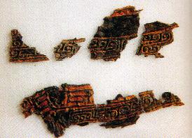 (商)彩绘雷纹漆器残片。台西村商代晚期居住遗址出土。该遗址共出土漆器残片26块。残片的木胎虽已腐朽无存,但器表的彩绘漆层却依然存在,而且色彩绚丽如新。这是我国目前已知时代较早的彩绘漆器。