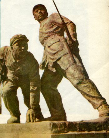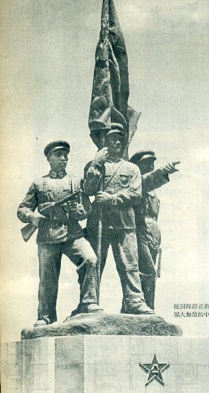 陵园里耸立着三座雄伟的铜像。这是强大无比的中国人民解放军的塑像。
