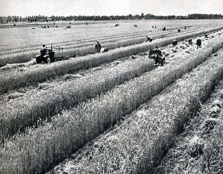 这是一个公社农机修造厂生产的供十二马力拖拉机牵引的小麦播种机。