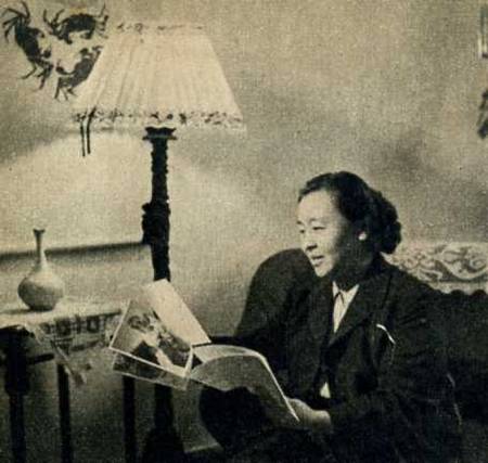 作家丁玲在看本报记者交给她的关于桑乾河人民生活的照片。