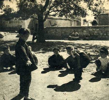 一群小学在屯里戏台前面做“瞎子捉拐子”的游戏。