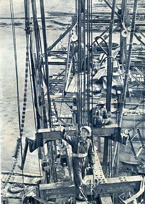 北京—广州铁路复线上横跨黄河的大桥正在施工。这一带河床变化多端,利用船只施工有困难,工人创造了水上栈桥和龙门架,使工程得以顺利进行。