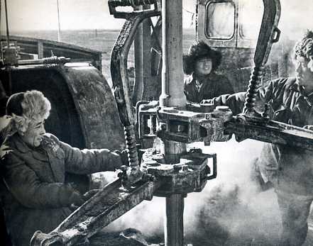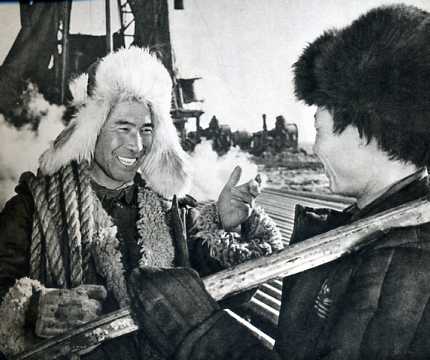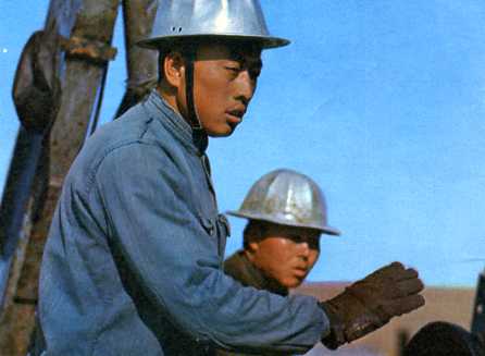 大庆工人阶级的杰出代表“铁人”王进喜(左),当年和钻井队员一起,艰苦创业,为开发大庆油田英勇奋战。
