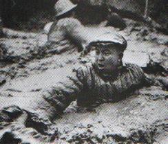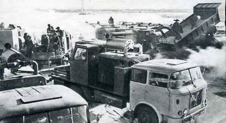 王进喜在泥浆池用身体搅拌水泥,防止发生井喷。