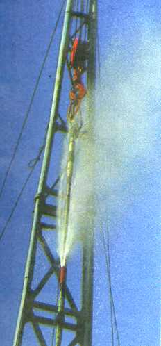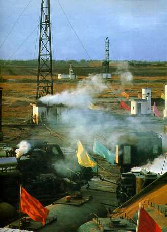 大庆油田通过输油管道送到祖国各地,这是新建成的一条长距离的输油管道,欢庆通油的人们喜看喷放来的自大庆的原油。