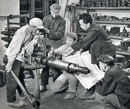 独创出水力式封隔器的研究一室的工人、干部、科技人员在进行152——2型水力压缩式封隔器的耐压试验。